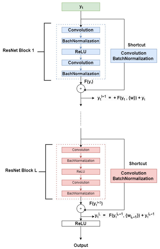 where is the input to the block, denotes the trainable parameters (weights and biases), and is the residual mapping comprising convolutional, normalization, and activation operations.