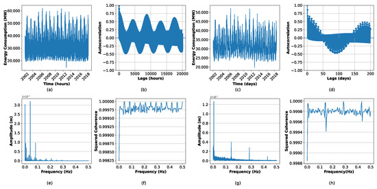 Figure 5 illustrates these complexities: strong seasonal trends with high variability and consumption spikes are evident in Figure 5a,c. The Hurst exponent (0.9109 for hourly, 0.8880 for daily) indicates persistence, while spectral entropy values (3.0579 for hourly, 4.0530 for daily) suggest significant noise. Autocorrelation functions (Figure 5b,d) show strong correlations across multiple lags with a sinusoidal pattern, reflecting seasonality. Squared coherence plots (Figure 5f,h) reveal a complex energy distribution across frequencies. Frequency domain analysis (Figure 5e,g) identifies dominant frequencies, with a primary 24 h cycle (0.0417 Hz), intermediate 10 h and 8 h periodicities, and additional peaks at 0.1429 Hz (weekly cycle), 0.3 Hz, and 0.412 Hz (bi-daily fluctuations). These complex properties in energy demand underscore the need for advanced forecasting techniques.