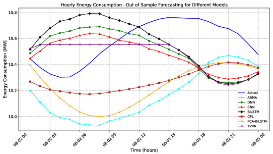 Figure 6 presents a comparative visualization of hourly energy consumption forecasts from various models against actual observed values. The proposed TVRN model exhibits superior performance in accurately capturing temporal trends and structures. Unlike ARIMA and ARMA, which struggle with nonlinearity and consistently underestimate energy demand, or CPL, which tends to produce flat-line predictions, TVRN effectively models the 24 h cycle, including midday peaks and evening declines. Compared to the erratic oscillations of DNN and CNN, TVRN provides smoother and more stable forecasts, reflecting improved generalization. A minor limitation is observed between 08-02 03:00 and 08-02 15:00, where the forecast slightly underestimates the rising demand, likely due to latent space compression or recursive error accumulation. Nevertheless, TVRN closely tracks actual consumption throughout the 24 h horizon, underscoring its robustness, low bias, and adaptability for short-term energy forecasting.