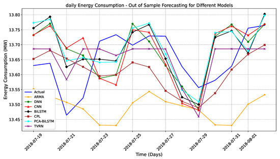 Table 4 presents the performance metrics of the forecasting model for daily energy consumption, based on in-sample data, alongside three different out-of-sample forecasting horizons: h = 1 day, 7 days, and 15 days. The results show that the proposed TVRN hybrid model consistently outperforms ARIMA, standard deep learning methods, CPL, and PCA-BiLSTM across the selected forecasting horizons. For instance, the TVRN demonstrates a notable improvement in RMSE compared to PCA-BiLSTM by 95%, 35%, and 30%, and similarly, improvements compared to CPL are 92%, 61%, and 66% for h = 1 day, 7 days, and 15 days, respectively. Enhancements are also evident in the MAE metrics. The traditional ARIMA model performs worse for h = 7 and 15 days ahead of the forecast horizons.