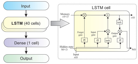 Artificial neural networks (ANNs) with integrated LSTM cells [29] are employed to perform the forecasting task. The LSTM architecture captures temporal dependencies across the input sequences and transmits the learned information to a fully connected layer, where each output node produces a single forecasted value. The dimensions of the input of the ANNs are the number of input time steps and the number of input variables. Figure 1 illustrates the architecture of the forecasting module. Figure 2 presents the overall structure of the artificial neural networks, along with a detailed schematic of the LSTM cells. Each LSTM unit consists of a memory block and three primary gates—input, output, and forget—that regulate information flow. This architecture enables the network to learn long-term dependencies by selectively retaining or discarding temporal information. Specifically, the input gate updates the cell’s content, while the forget gate determines what information in the memory state should be kept or discarded at any given moment. At the same time, the output gate manages the information that is passed from the memory unit. Rectangular boxes represent activation functions applied after matrix multiplication, while circular spots indicate element-wise operations. In Figure 2, , , and correspond to the input, hidden state, and cell activation vector, respectively, with denoting the sigmoid activation function. The cell’s output is a weighted sum of , , and a bias term, passed through a sigmoid activation [30].