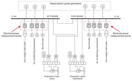 Power measurements were recorded at the ship’s high voltage main switchboard connection points (highlighted in Figure 3) over approximately four months with ten-minute sampling intervals. Each dataset channel corresponded to a specific shipboard electrical load.