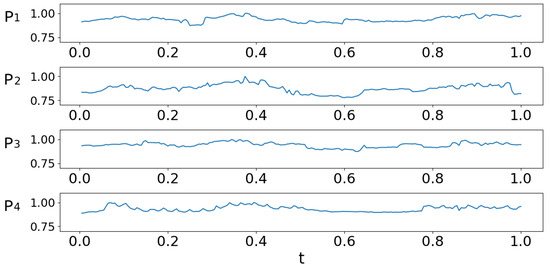 For our analysis, we selected four variables from the electrical load time series—designated as , , , and —to serve as the channels of the time series. Each variable comprised 17,569 data points (spanning roughly 122 days) that were normalized to the range before processing. Figure 4 illustrates a 200-time-step window of the four electrical power time series under consideration, normalized.