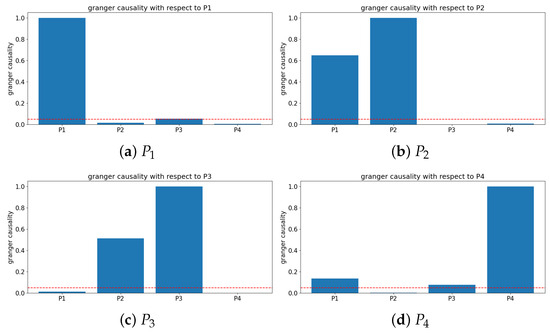 Pairwise Granger coefficients among , , , and . The dotted horizontal line indicates the Granger threshold.