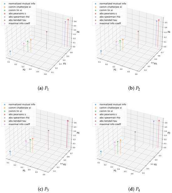 In this study, correlation was assessed using a range of well-established measures, including Pearson, Spearman, Kendall, and normalized mutual information, as well as more recent indices such as Chatterjee’s rank correlation [33], Lin’s coefficient [34], and the maximal information coefficient (MIC) [35]. As illustrated in Figure 6, the choice of correlation metric significantly influenced the interpretation, with several coefficients revealing a non-negligible degree of shared information among the data channels.