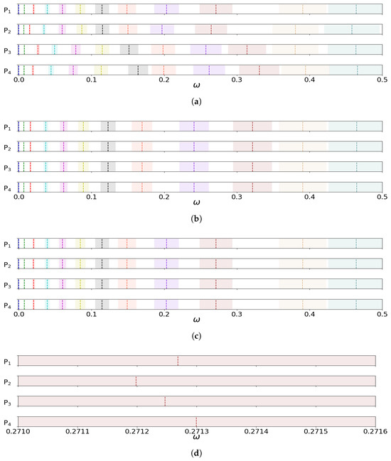 Figure 7 presents a set of graphs illustrating the modes generated for each of the four variables under consideration, represented in the frequency domain. Graph (a) depicts VMD (and VMDMS, which produces an identical decomposition), generating non-aligned modes. Graph (b) shows NCVMD, which aligned the modes of the auxiliary channels with those of the main channel, here considered as the first channel: by design, in NCVMD, the representation was identical to that of VMD and VMDMS, while the representations of the other () channels’ modes approximately aligned with . Finally, Graph (c) illustrates MVMD, which perfectly aligned the modes’ central frequencies without prioritizing any particular channel, while Graph (d) shows a zoomed-in version of Graph (b) that highlights the misalignment among the central frequencies.
