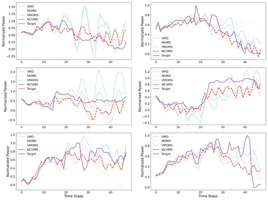 Forecasting results for the normalized powers and obtained when switching the decomposition module. First column: forecasts for the time slots 1, 2, and 3 of (top to bottom). Second column: forecasts for the time slots 1, 2, and 3 of (top to bottom). In the graphs, the violet line represents observation (Target), the blue line depicts the result when the decomposition module was VMD, the orange line depicts the results for MVMD, the green line represents the results for VMDMS, and the red dashed line depicts the results when using NCVMD as the decomposition module (i.e., NCD-Pred). The graphs were normalized by dividing by the maximum observed values of , over the 24 h test period.