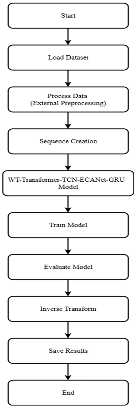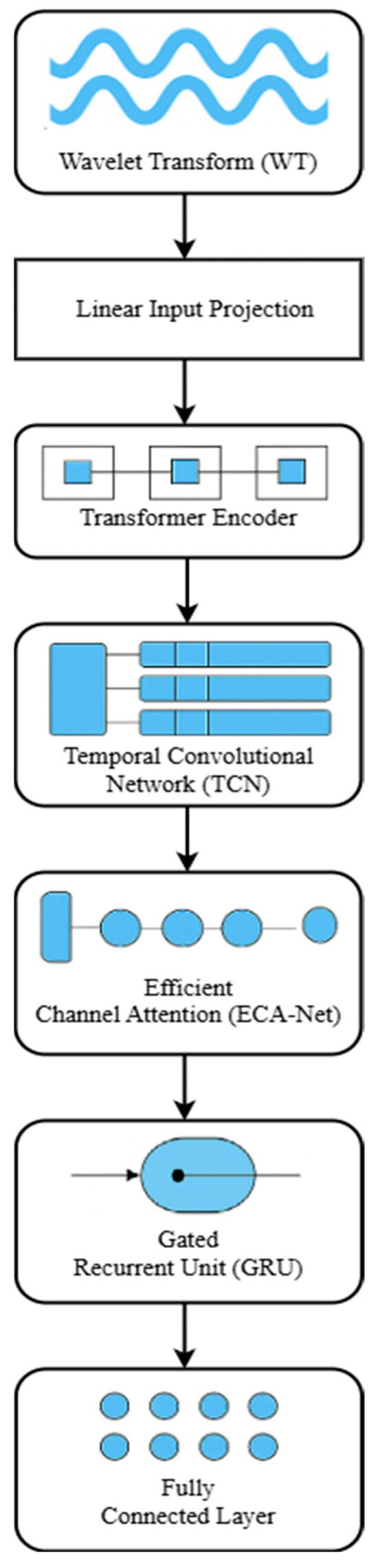 WT–Transformer–TCN–ECANet–GRU is a novel hybrid deep architecture specifically designed for PV power forecasting. The proposed model integrates multiple modeling paradigms (frequency domain analysis, attention mechanisms, and sequential learning) to capture global and local temporal dependences in time series data effectively. The proposed architecture is composed of a structured pipeline of specialized modules, each module being specifically designed to extract, transform, and cleanse temporal features of high fidelity.