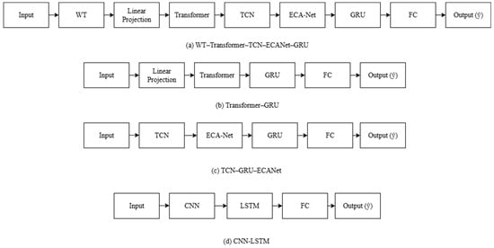 The enhanced potential of the proposed WT–Transformer–TCN–ECANet–GRU framework stems from the complementary deployment of specialized modules designed to address specific attributes of short-term PV power forecasting. By combining multiresolution decomposition, global attentions, localized extraction of temporal patterns, and memory-efficient sequential mechanisms, the model effectively leverages both short- and long-distance temporal dependencies inherent in non-stationary PV time series.