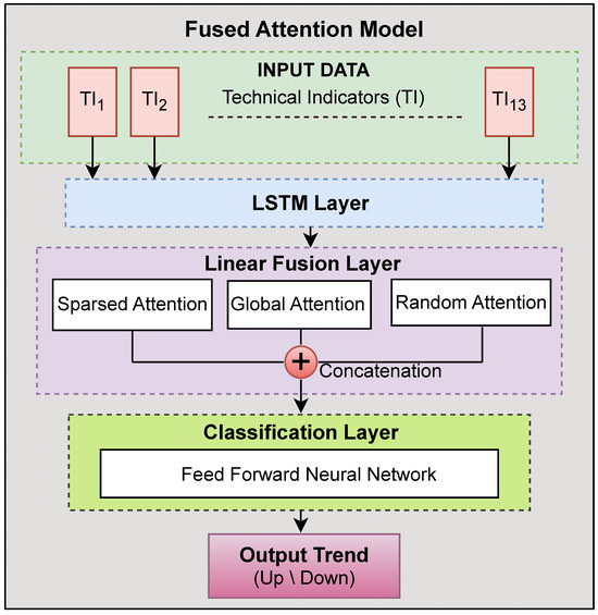 Deep learning models have been coupled with attention processes meant to increase feature selection and sequence learning to raise forecasting accuracy [5,6,7]. For many natural language processing and time-series forecasting applications, standard attention methods, including Vanilla Attention and Self-Attention, have proven successful. In the context of stock market prediction, nevertheless, they frequently fail to balance short-term volatility with long-term dependency, thus producing less-than-ideal results. We present a Fusion Attention Model using a linear fusion approach to combine Sparse Attention, Random Attention, and Global Attention, thus addressing these difficulties and improving predictive performance.