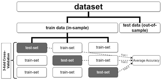 A graphical representation of a 3-fold cross-validation process. A graphical representation of a 3-fold cross-validation process. For every set of hyperparameters tested, each fold serves as a test sample, while the remaining folds are used to train the model. The average performance for each set of parameters over the k test folds was used to identify the best model [30].