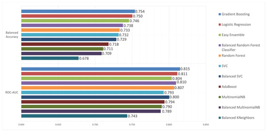 There are various empirical techniques that can be implemented to handle class imbalance. Oversampling techniques, like SMOTE, ADASYN, etc., create and add artificial observations inflating the minority class, under-sampling techniques reduce the number of observations for the majority class, and cost-sensitive learning applies a higher cost to the minority class in the cost function or assigns class weights. In our case, the minority class is approximately 12% of the data, which represents a moderate imbalance. In such settings, balanced class weights are sufficient to achieve a good performance, especially in conjunction with tree-based classifiers (e.g., Random Forest, XGBoost), which are intrinsically less sensitive to class imbalance than linear models. So, to handle class imbalance, we used both class weights in the training process and also in the cost function; in construction, the minority class is given 5 times the cost of the majority one. Moreover, some of the algorithms selected to be used for the classification are specifically designed to handle class imbalance: (a) the Easy Ensemble classifier, which was introduced by Liu, Wu et al. (2009) [28] to address imbalanced classification problems by leveraging ensemble learning; and (b) the Balanced Bagging classifier, which is a variation of the traditional Bootstrap Aggregating (Bagging) algorithm and can handle class imbalance.