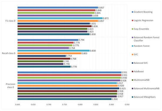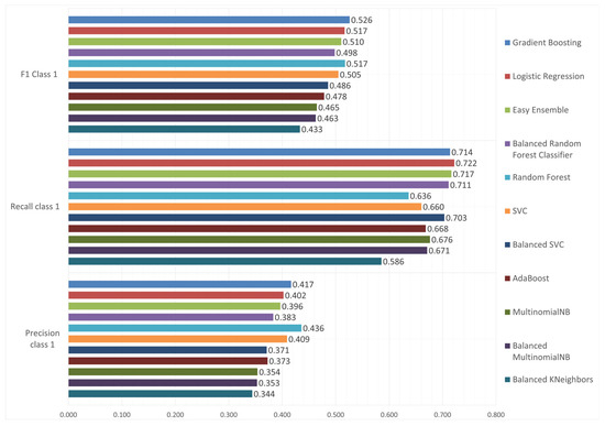 To address the issue of the imbalanced dependent variable, the models were trained using balanced class weights. This approach involves assigning higher weights to the underrepresented class (class 1—investment-ready) and lower weights to the overrepresented class (class 0—not investment-ready) during the training process. By doing this, the model in the training process is penalizing the misclassification of the minority-class observations more, thus encouraging it to pay more attention to the less frequent observations.