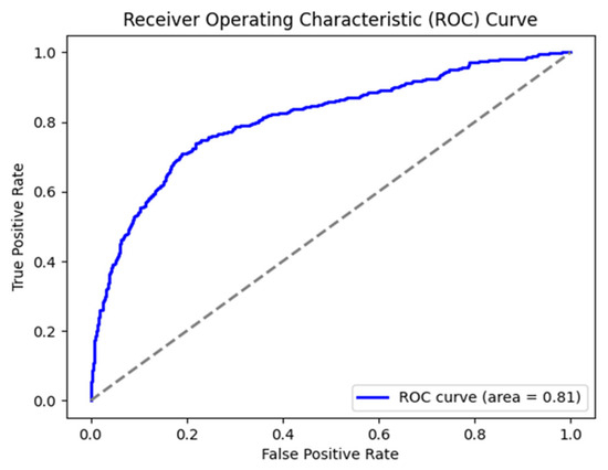 The ROC AUC (Figure 3) quantifies the model’s ability to discriminate between classes. The ROC curve plots the true positive rate (sensitivity) against the false positive rate (1-specificity) at various threshold settings, while the area under curve (AUC) ranges from 0.5 (no discriminative power, equivalent to random guessing) to 1 (perfect discrimination).