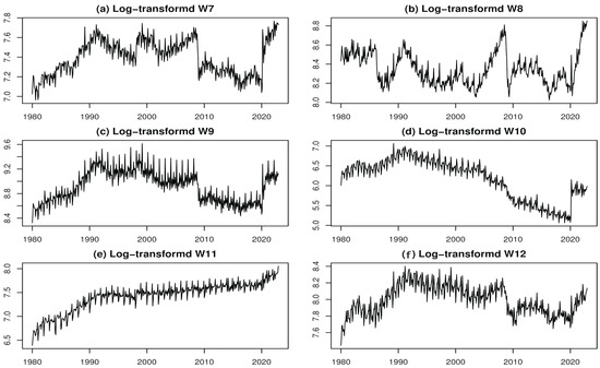 We analyzed the data for wholesale sales (WS) across the 12 business types listed in Table 1. The original data are available from Japan’s Ministry of Economy, Trade, and Industry (https://www.meti.go.jp/english/statistics/index.html, accessed on 1 May 2023). Each business type’s data form a monthly time series spanning from January 1980 to December 2022, totaling months, with the data measured in units of one billion JPY. To facilitate analysis, we applied a logarithmic transformation to each type’s time series, resulting in logarithmically transformed WS, denoted as log-WS. The log-WS data for each business type constitute the objective of our analysis. Figure 1 shows graphs of log-WS time series from W1 to W6 in Japan (January 1980 to December 2022).