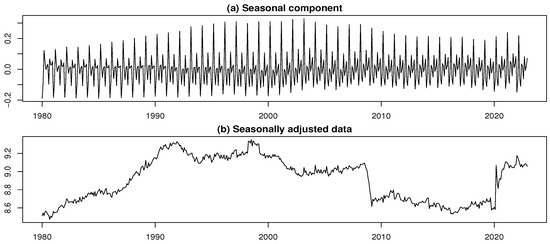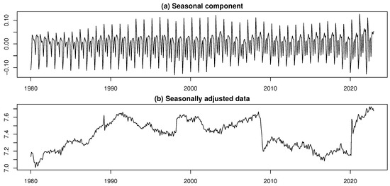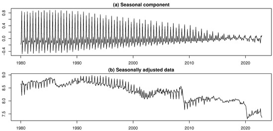 When we observe Figure 3a, we find the following features. The estimate of the seasonal component highlights a clear seasonal pattern. However, note that the amplitude of seasonal fluctuations gradually decreases over time. More specifically, there was initially a clear seasonal variation, where the amplitude of seasonal component peaked in the early 1990s. In subsequent periods, the amplitude continued to decline. In other words, a structural change is considered to have occurred before and after the period of the early 1990s. The period from around 1992 to around 2012 is often referred to as the lost two decades of the Japanese economy (see, e.g., [22]). That is, clear structural changes can be confirmed in the sector of general merchandise during the lost two decades of the Japanese economy. This observation suggests a potential shift in consumer behavior or economic conditions influencing seasonal sales patterns in the sector of general merchandise. Such insights into the seasonal dynamics of General Merchandise can inform strategic decision-making behavior and resource allocation for businesses operating in this sector. Moreover, looking at the graph of seasonally adjusted data in Figure 3b, we notice that the pattern of seasonally adjusted values changed abruptly in the late 2000s and early 2020s. These two pattern changes can be attributed to the following events. The sharp decline in seasonally adjusted data at the end of the 2000s is closely related to the global financial crisis. In addition, the sharp decline in seasonally adjusted values in the early 2020s can be regarded as attributable to the COVID-19 pandemic.