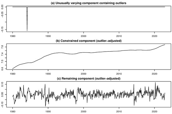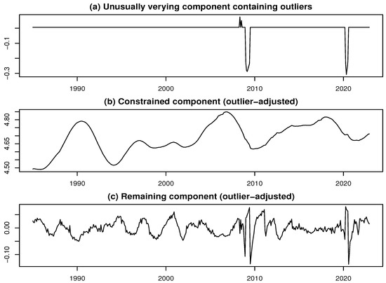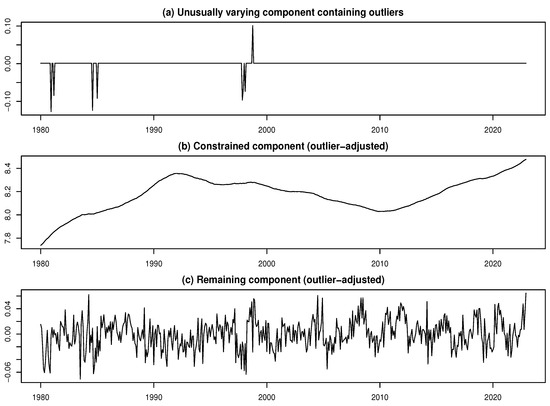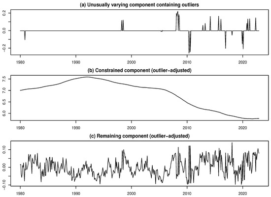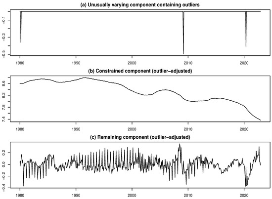 Furthermore, our extended ML model approach was applied to the seasonally adjusted time series. In this step, to execute the extended ML approach, we needed to estimate the value of k (which denotes the width of the time interval for the third-time decomposition). The results indicate that the estimated value of k, denoted as , is 63, and the number of outliers is estimated to be . Based on the magnitude of their amplitude, the outliers are estimated to occur at time points 351, 485, and 3, according to the rule for identifying outlier locations. These correspond to March 2009, May 2020, and March 1980, respectively. Figure 4 shows the final decomposition results.