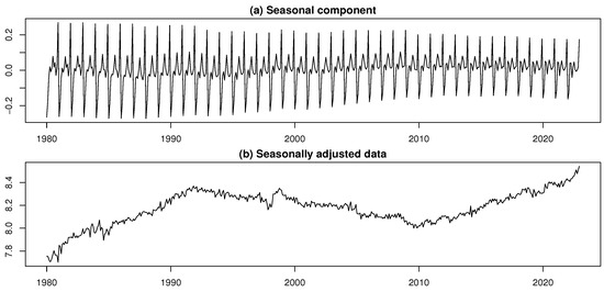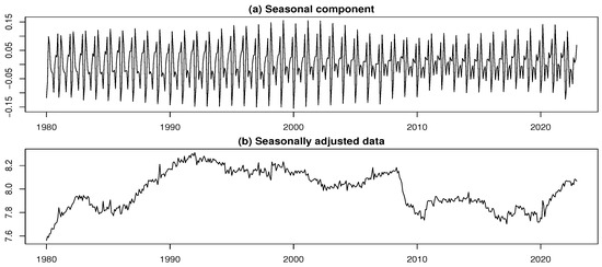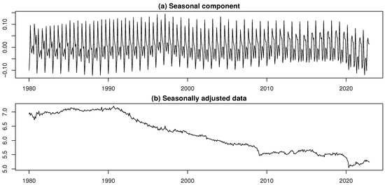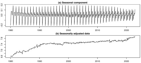 The ML model approach proposed by [13] was developed to overcome these limitations. It provides a simple and flexible framework for modeling non-stationary time series without relying on stringent distributional assumptions. Building upon this, ref. [19] proposed a seasonal adjustment method based on the ML model and demonstrated that it achieved improved performance compared with X-13ARIMA, particularly in capturing structural changes and seasonal dynamics in economic time series. In this study, we further introduce the DFDL model, which enables decomposition of components without assuming a specific distribution, providing robustness against non-normality and heteroscedasticity.