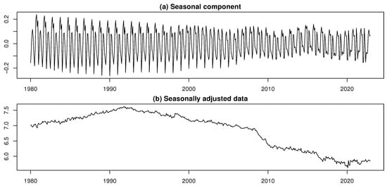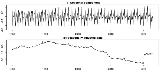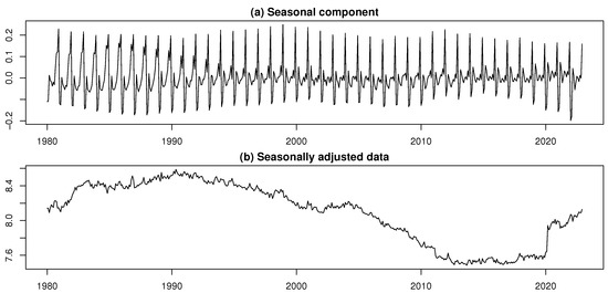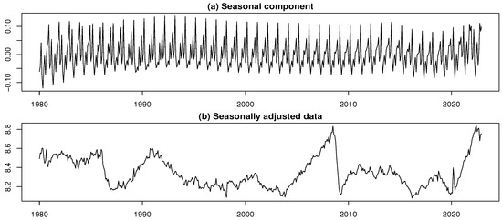 Next, the estimated time-series data of each composite component were sequentially synthesized into monthly time-series data. Following that, we conducted constrained and seasonal components decomposition of the monthly time series for the decomposed composite component. This involved decomposing the monthly time series of the decomposed composite component into a constrained component and a remaining component, which is equivalent to the seasonal component, using the ML model approach. Among the results obtained for k (representing the width of the time interval for the second-time decomposition) at values of , the maximum log-likelihood was achieved at . This estimated value of k, denoted as , informed the decomposition of the constrained and remaining components of the time series, which was conducted using . The result for the remaining component was then utilized as the final estimate of the seasonal component. Furthermore, by subtracting this estimate from the original time-series data, the seasonally adjusted monthly time series was derived.