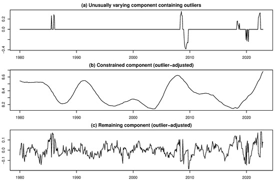 Figure 4a illustrates the estimate for the unusually varying component, containing outliers. Figure 4b,c present the estimates for the constrained component (representing the trend) and the remaining component (representing cyclical variations), respectively. The following can be seen from each panel of Figure 4. From panel (a), three negative outliers stand out at first glance. These outliers suggest that business fluctuations were influenced by unforeseen events or external shocks. We observe that the shape of the graph of the constrained component in panel (b) changes (i.e., there are changes in the trend) around the time when these significant negative outliers are observed. The significant negative outliers in the late 2000s and early 2020s are considered to be closely related to the global financial crisis and the COVID-19 pandemic, respectively, as described above. The significant negative outlier in the early 1980s may be related to the second oil crisis of 1979–1980. In the graph of the residual component in panel (c), we also observe significant fluctuations with large amplitudes in the early 1980s, late 2000s, and early 2000s. Based on the above results, several key insights can be derived from an economic perspective. The downturn between 2008 and 2009 appears to be a consequence of the global financial crisis. This widespread financial market turmoil led to a decline in corporate and consumer confidence, contributing to a sharp economic contraction. The downturn in the beginning of 2020 can be attributed to the COVID-19 pandemic. Global containment measures restricted business operations and international trade, directly impacting economic activities. In other words, demand for wholesale products of general merchandise decreased during the global financial crisis and the COVID-19 pandemic.