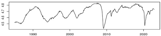 The dataset for Japan’s coincident CI is available from the website of Economic and Social Research (https://www.esri.cao.go.jp/en/stat/di/di-e.html, accessed on 1May 2023) within the Cabinet Office of the Japanese government. These data represent a monthly time series spanning from January 1985 to December 2022, covering a total of months. Similar to the processing of the aforementioned wholesale sales data, we also applied a logarithmic transformation to the CI data. We refer to the logarithmic CI as log-CI. Figure 27 displays the time series plot for the log-CI.