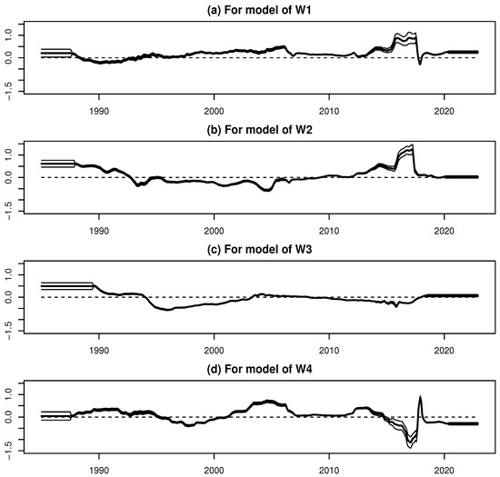 Figure 29 presents the estimated time-varying coefficients for each model (W1–W4). In each panel, the mean is depicted by a thick solid line, its ±2 standard deviation band by thin solid lines, and the zero level by a dashed line.