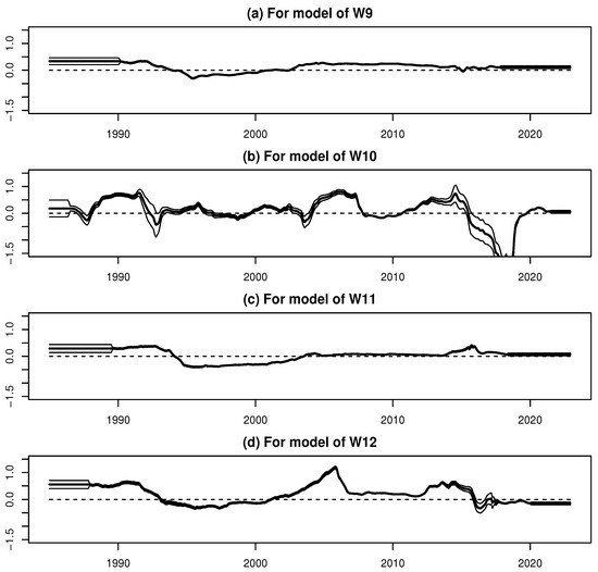 Figure 31 indicates the graph of estimated values of the time-varying coefficients in each model for W9–W12.