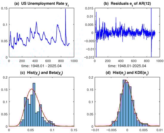 Preliminary data analysis: (a) US monthly unemployment rate from 1948.01 to 2025.04; (b) Residuals obtained by fitting with an AR(12) model; (c) Histogram and Beta (11,183) density of ; (d) Histogram and Kernel density (KD) of .