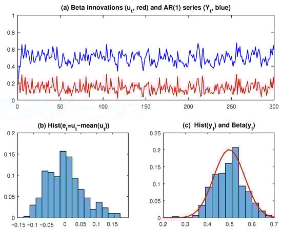 Display of a simulation of model (15a): (a) Series (blue) and beta innovations (red); (b) Histogram of ; and (c) Histogram of and its beta density .