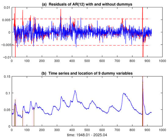 Effects of dummy variables on a linear AR(12) model: (a) Residuals with (blue) and without (red) the dummies; (b) Location of the dummies in the series.