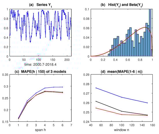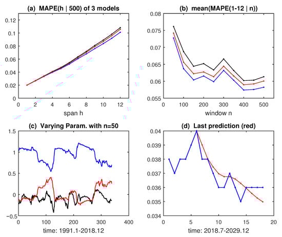 Results of the procedure (13) on the models (17): linear (black), beta (red), hybrid (blue): (a) MAPE() statistics during the period 1991–2019, with n = 500; (b) Effects of the size n on the average MAPE(h); (c) Time-varying parameters of the hybrid model with n = 50, in the forecasting period; and (d) Last prediction (red).