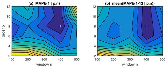 Following Equation (14), we evaluate the joint effect of the model order p and sample size n on the MAPE(h) statistics of regular AR(p) models, in the same way as Figure 5b. The rationale of using all coefficients is that some may locally be significant in the out-of-sample period and may be useful in forecasting; similarly, the selection of n should be based on prediction errors, rather than in-sample residuals. The results for H = 1, 12 are displayed in Figure 6 for the hybrid model; the optimal values during the period 1991–2019 are = 8, = 400. This means that parsimonious AR models () are not suitable for both short- (h = 1) and long-range forecasts of the US unemployment series.