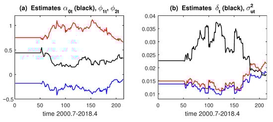 This expression shows that could potentially be stabilized by , reducing the heteroskedasticity of the model. In general, the ultimate purpose of time-varying parameters is to obtain stationary (homoskedastic) residuals. The approach followed in this paper with Equation (12) is entirely non-parametric, and n could also be selected to achieve the desired variability of .