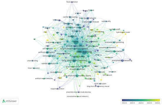 The POWER dataset, a platform developed by NASA utilizing remote sensing techniques, provides a valuable resource for the analysis of monthly, climatic, and annual seasonal data. These data contribute significantly to a better understanding of climatic variables, particularly when compared with observational records. For instance, Abdul Hasib Halimi and colleagues compared NASA POWER reanalysis data with observations from meteorological stations located in the Mediterranean and continental regions of Turkey, and reported that the dataset demonstrated high accuracy in estimating temperature and relative humidity [8]. Tan et al. conducted a thorough study of gridded climate products, notably NASA POWER and ERA5-Land, in a tropical river basin, highlighting both their promise and limits in capturing precipitation dynamics and extremes. Their findings emphasize the necessity of combining sophisticated data analysis approaches with remote sensing and reanalysis products to improve hydrological modeling and severe event forecasting in unmonitored or data-poor locations [9]. A thorough review of the literature was carried out utilizing the keywords “precipitation, AND LSTM” in the Web of Science database. The assessments conducted in 2025 showed that, including the relevant keywords, there were 985 academic studies in total. VOSviewer V1.6.20 software was used to connect the studies using a restricted set of keywords [10,11]; Figure 1 provides a visual representation of the connections among the identified keywords.