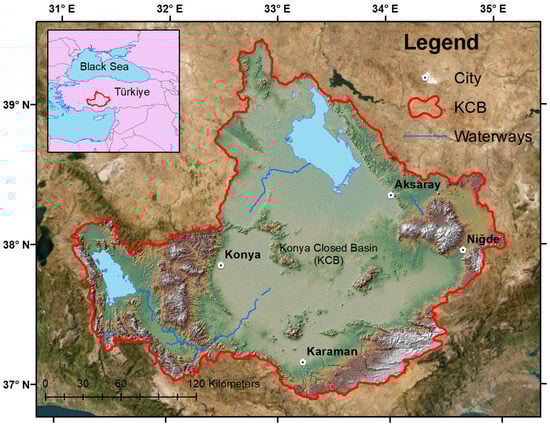 The Konya Closed Basin (KCB) is one of the most significant endorheic basins located in the central part of Turkey’s Central Anatolia Region (Figure 2). Covering an area of approximately 50,000 km², the basin is of critical importance both hydrologically and ecologically. Surrounded by mountains, this closed basin possesses a unique drainage structure that prevents natural outflow to the sea, resulting in the retention of water within the basin. The region is characterized by a semi-arid continental climate, with limited and irregular annual precipitation. Agriculture constitutes the dominant land use in the area, with water demands largely met through groundwater and surface water resources [16,17]. However, due to increasing anthropogenic pressures and climatic variability, significant declines in groundwater levels and shrinkage of wetland areas have been observed.