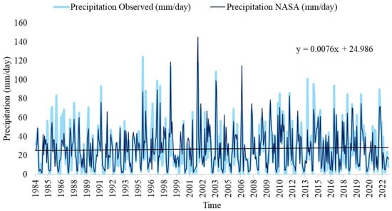 In Figure 3, the blue line represents ground-based MGM observations, while the black line corresponds to NASA/POWER satellite data. Both series are shown in millimeters (mm). The plot highlights seasonal and interannual variability as well as the overall consistency between the two datasets.