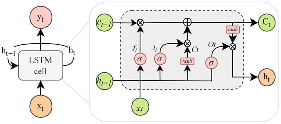 The parameters of the gates include weights (Wi, Wf, Wc, Wo) and biases (bi, bf, bc, bo) corresponding to the input (xt) and prior hidden state (ht−1). The cell state flowing through the input gate ranges from −1 to 1. The memory cell has two states: present (Ct) and previous (Ct−1). “tanh” is the hyperbolic tangent activation function, while σ is the sigmoid activation function. ⊗ represents the convolutional operation (Hadamard product). The cell’s output (ht) is determined by its current state and output gate [24].