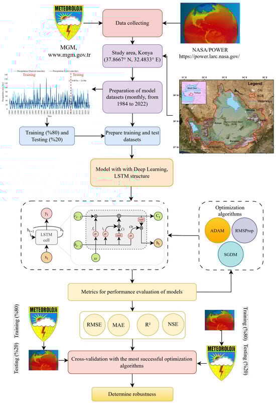 In this study, monthly precipitation data from Konya, one of Turkey’s driest regions, were collected for the period 1984–2022 from both ground-based meteorological stations and NASA’s POWER database. The main objective was to assess the capability of deep learning methods, specifically Long Short-Term Memory (LSTM) networks, in forecasting monthly precipitation under arid conditions. For model development, the dataset was divided into training (80%) and testing (20%) subsets. Three widely used optimization algorithms—Adaptive Moment Estimation (ADAM), Root Mean Square Propagation (RMSProp), and Stochastic Gradient Descent with Momentum (SGDM)—were compared using standard statistical metrics to evaluate forecasting accuracy and model robustness.