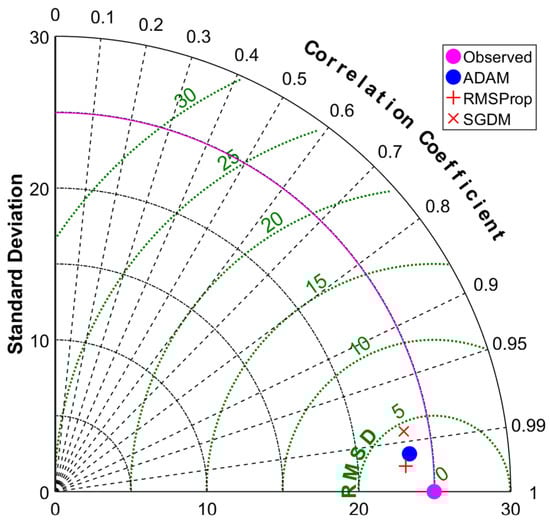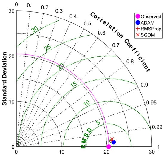 This study also evaluates the performance of LSTM under different optimization algorithms through Taylor diagrams, which visually illustrate forecasting accuracy and consistency with observed data. The diagrams are presented below in Figure 8 and Figure 9.