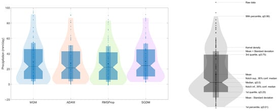To further evaluate the distribution and variability of model predictions, a violin plot was employed. Violin plots combine box plot features with kernel density estimation, allowing a detailed visualization of prediction spread and central tendency. As shown in Figure 10 and Figure 11, LSTM-ADAM produces distributions that closely resemble the observed data and provide more reliable predictions.