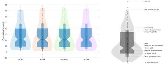 Violin plot of observed MGM data comparing optimizers (ADAM, RMSProp, SGDM).