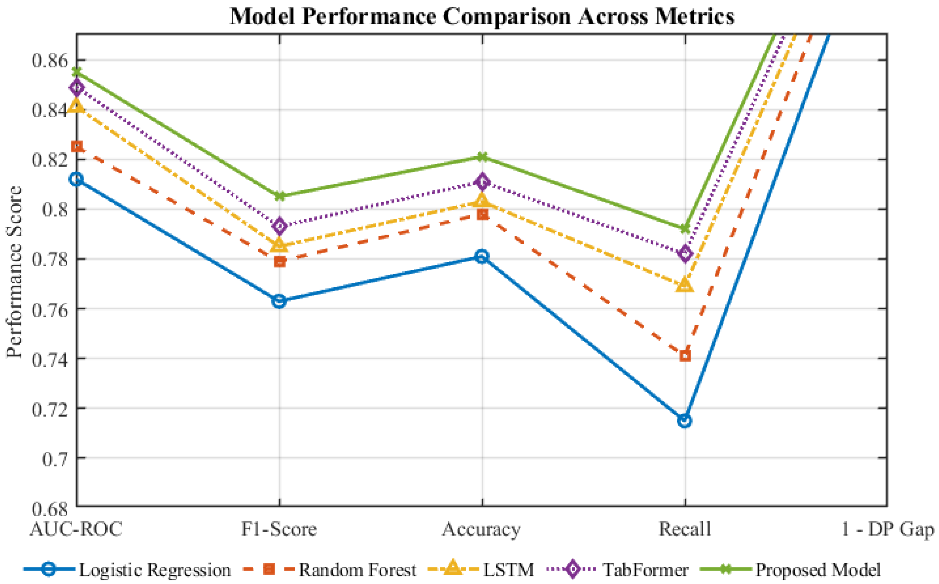 Figure 4 visually summarizes the comparative results across multiple evaluation metrics, including AUC-ROC, F1-score, Accuracy, Recall, and fairness (1–DP_Gap). As shown, the proposed model consistently achieves the highest performance across all metrics, confirming the quantitative trends reported in