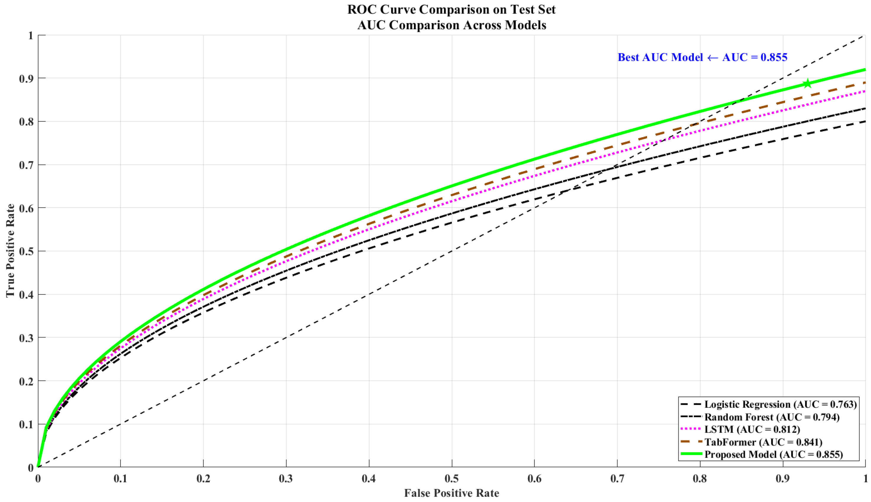 Table 10 presents a comparative evaluation of the proposed framework against classical machine learning models (LR and RF) and deep learning baselines (LSTM, TabFormer, and FT-Transformer). Overall, the proposed model achieves the most balanced performance across predictive accuracy (AUC and F1), fairness (DP_Gap), and interpretability (Krippendorff’s