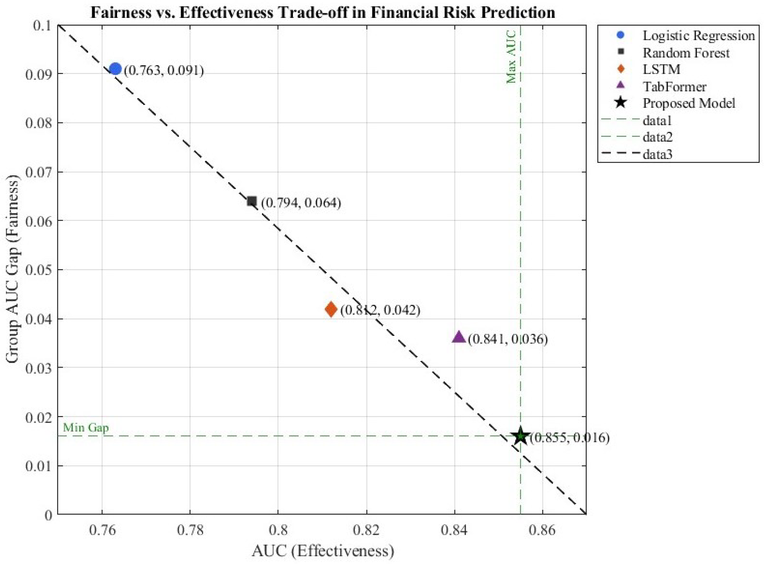 Figure 7 illustrate the ROC curves, group-level fairness gaps, and the trade-off between fairness and predictive effectiveness. These visualizations demonstrate that the proposed framework consistently achieves higher accuracy while simultaneously reducing performance disparities between institutional subgroups. The observed pattern underscores the effectiveness of the multi-objective optimization strategy: its benefits extend beyond predictive accuracy to encompass fairness across different institution types. This finding aligns with the broader fairness-aware principles that guide modeling practices in public-sector risk governance [