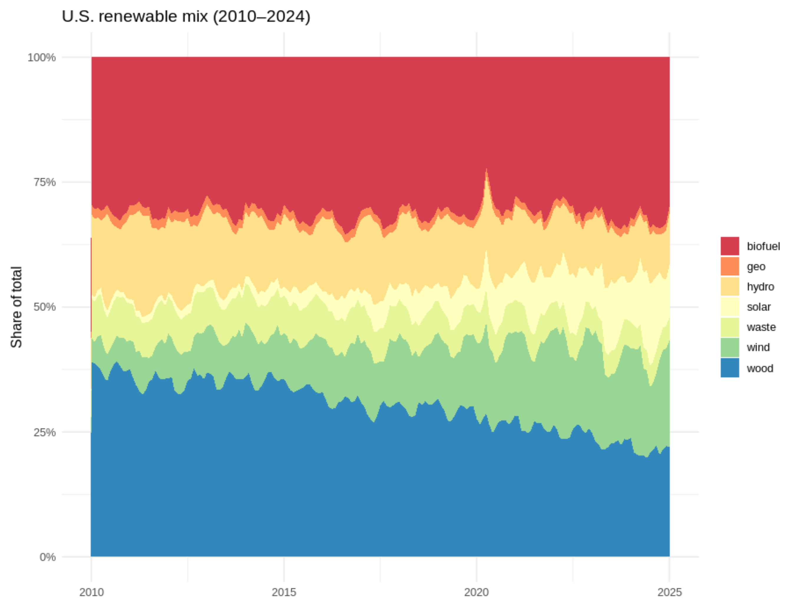 Figure 1. Monthly U.S. renewable energy mix, 2010–2025. Hydro loses ground, while wind and solar expand rapidly. Seasonality is most pronounced in hydro (spring runoff) and wind (winter–spring peak). Areas are stacked so each month sums to 100%.
