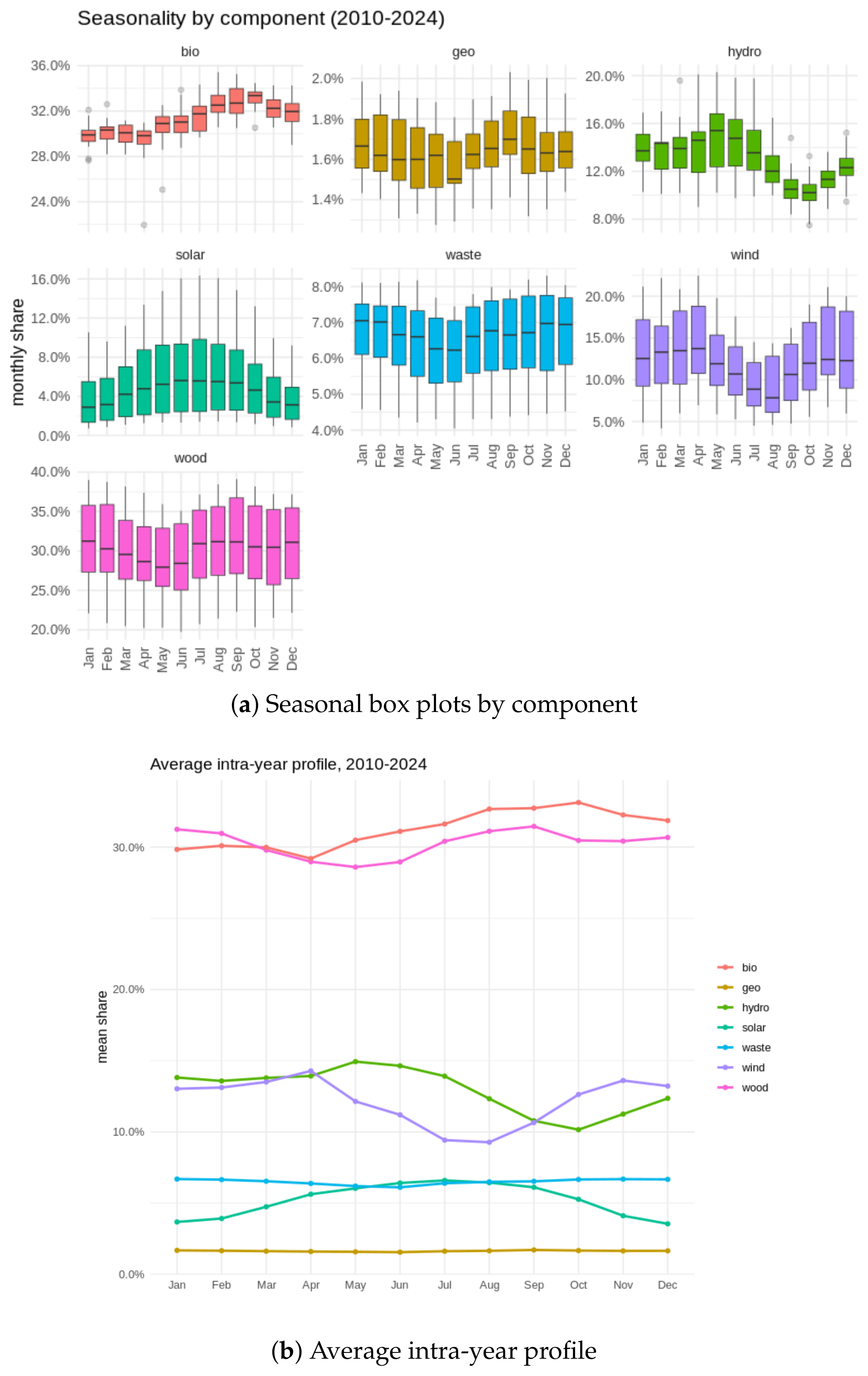 Panel (a) of Figure 2 shows componentwise box plots of monthly shares for 2010–2024; panel (b) traces the mean intra-year profile. Hydro exhibits the largest seasonal swing, peaking in April–May and troughed in late summer, while wind follows a bimodal winter/autumn pattern and solar the mirror image with a July plateau. Biomass, geothermal, and waste are comparatively flat, with median intra-year movements below 1 pp.