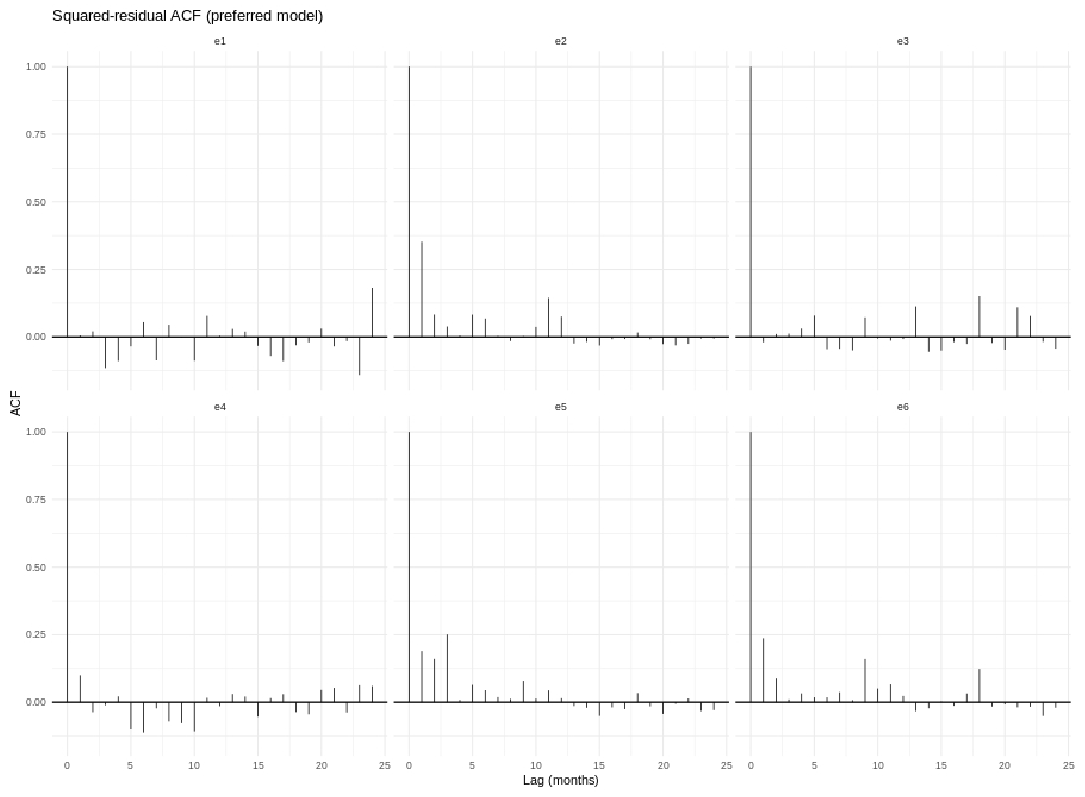 Figure 5. ACF of squared residuals for the preferred VAR(2) + season model.
