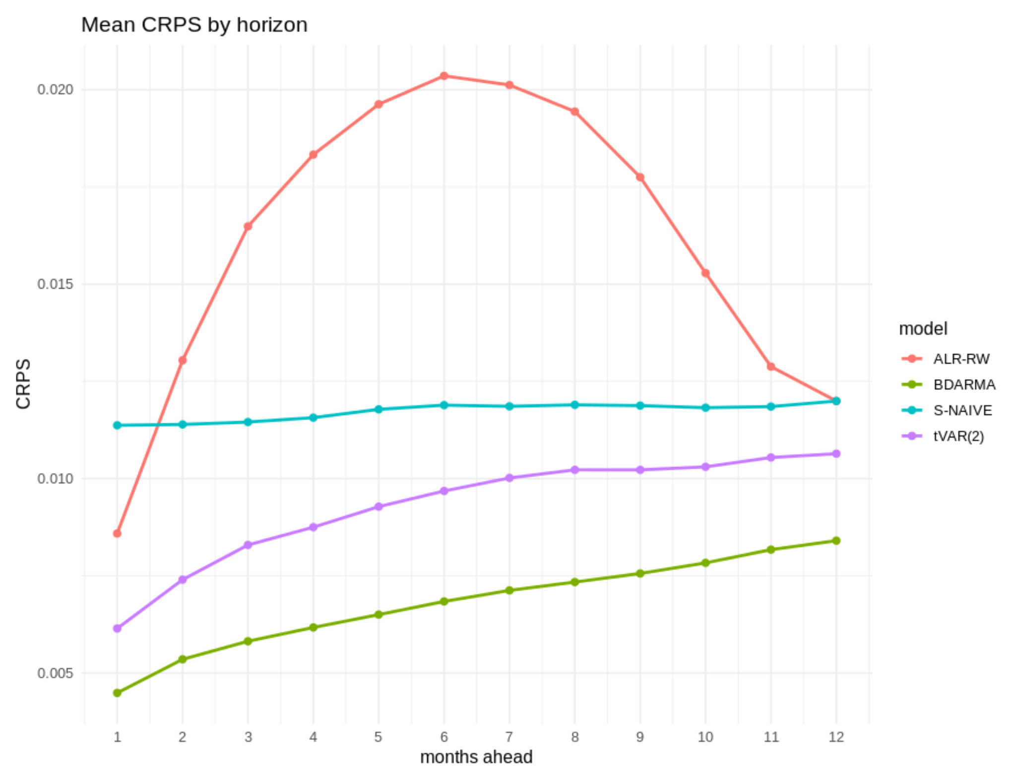 Table 4. Mean CRPS across rolling origins. Boldface marks the best score for each horizon.