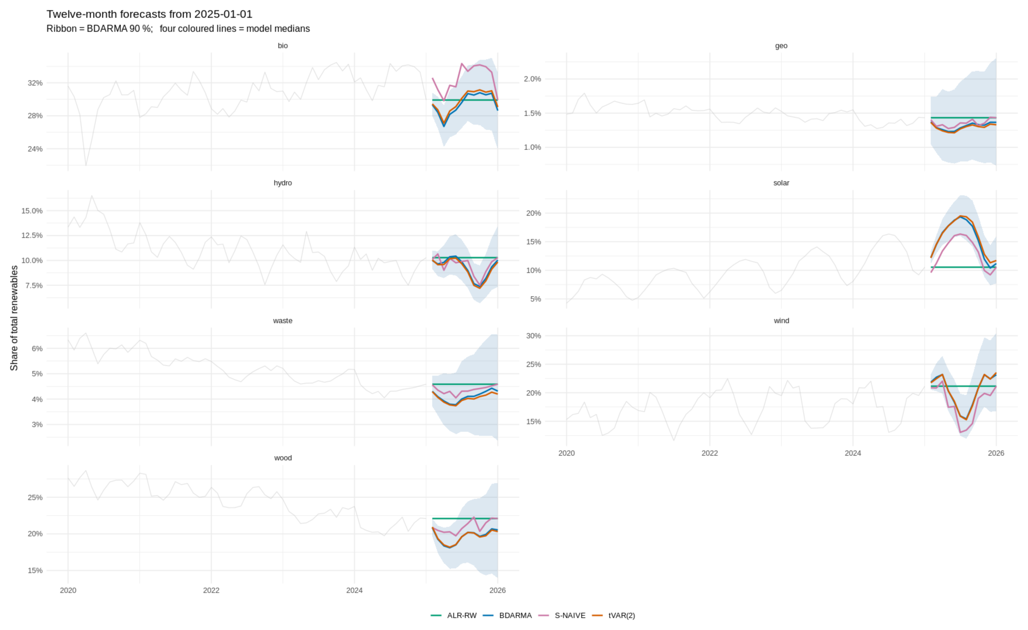 Figure 8. Twelve-month forecasts issued 1 January 2025 after refitting all models to the 2010–2024 sample. Blue shading denotes the BDARMA 90% predictive interval. Colored lines are posterior or plug-in medians. Axes are free by facet.