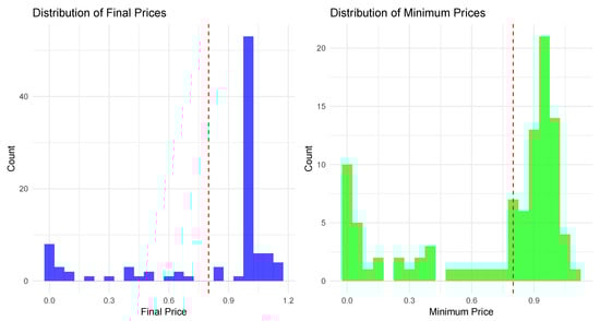 Visual justification for the $0.80 failure threshold. The figure displays histograms for two key price points across the 98 stablecoins in our sample: their final observed price (left panel) and their all-time minimum price (right panel). The red vertical line at $0.80 illustrates how this threshold effectively separates the distribution of failed or distressed stablecoins (concentrated below the line) from those that maintained their peg (concentrated near $1.00).